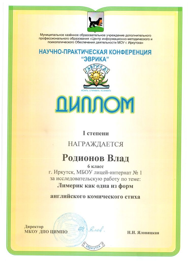 Поздравляем победителей городской научно-практической конференции обучающихся 5-8 классов "Эврика" - 2013 - Родионова Владислава, обучающегося 6 класса (работа "Лимерик как одна из форм английского комического стиха") и Твердохлебову Софью, обучающуюся 8А класса (работа "Архитектурные ордера в зданиях города Иркутска")!