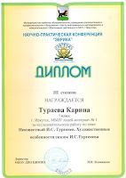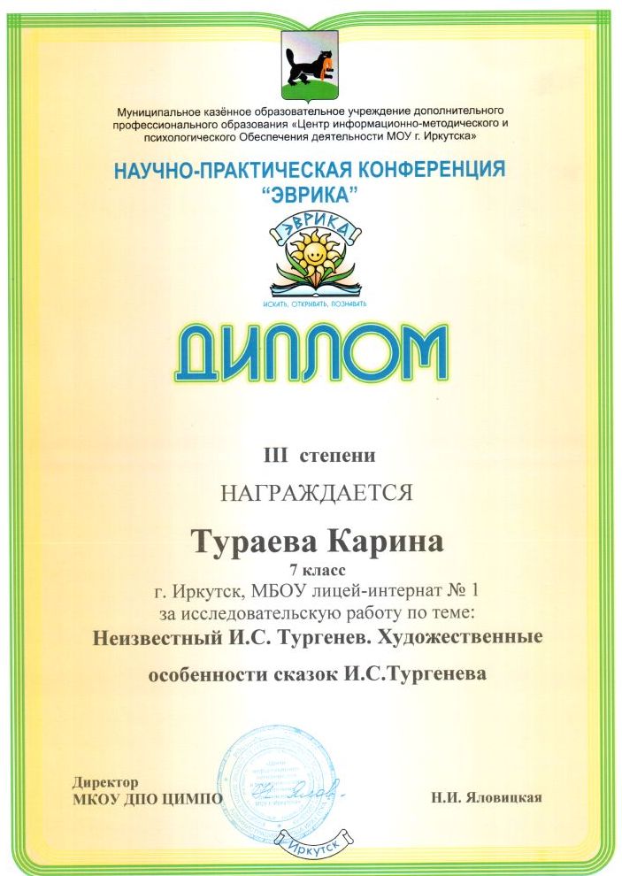 Поздравляем призёра конференции - Тураеву Карину, обучающуюся 7А класса (работа "Неизвестный И.С. Тургенев. Художественные особенности сказок И.С. Тургенева")!