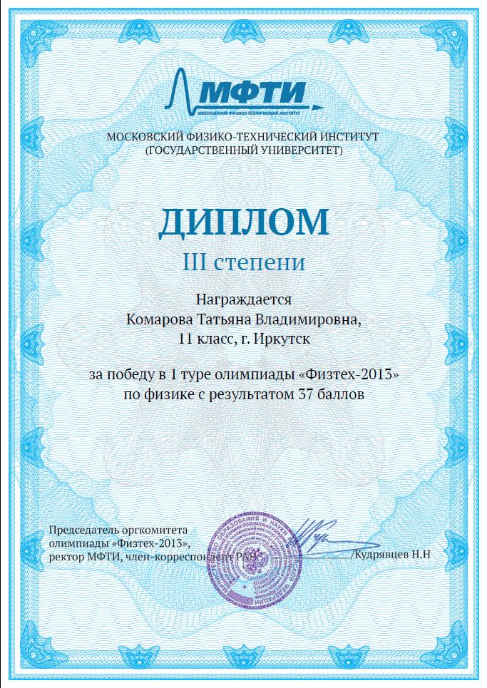 Поздравляем призёра онлайн этапа Олимпиады МФТИ "Физтех - 2013" – Комарову Татьяну, обучающуюся 11Б класса!