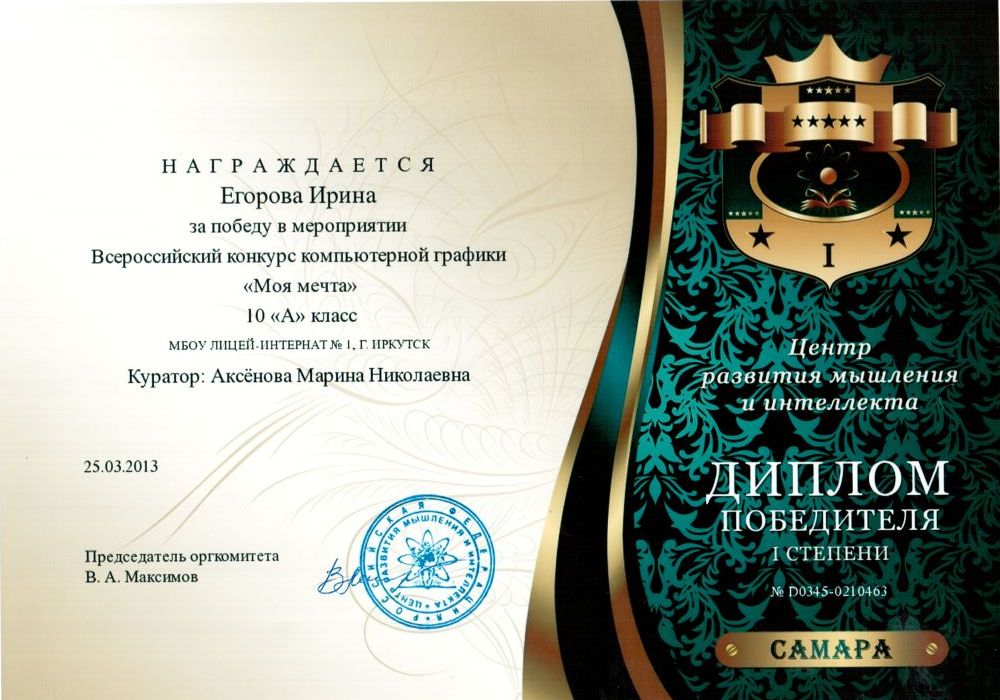 Поздравляем победителя Всероссийского конкурса компьютерной графики "Моя мечта" - Егорову Ирину, обучающуюся 10А класса!