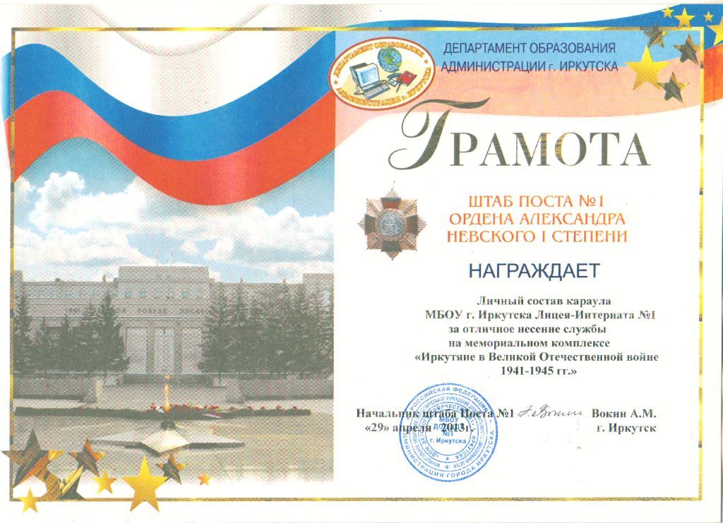 В апреле 2013 г. лицеисты достойно несли почётную службу - Вахту памяти на Посту № 1 у Вечного огня Славы.