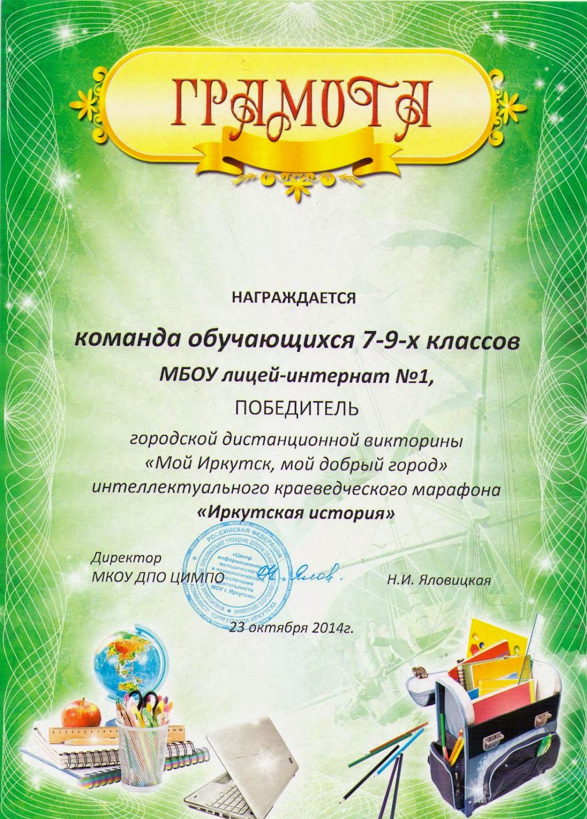 В состав лицейской команды вошли девятиклассники: Пономарёва Екатерина, Бучнев Алексей и Айсанов Евгений. При регистрации каждая команда должна была предложить 10 вопросов по теме «Известные люди в Иркутске». Вопросы лицейские участники викторины придумывали под руководством Калмыниной О.А., зам. директора по НМР. 19 сентября 2014 г. с 15-00 до 16-00 часов команды соревновались в дистанционной викторине в режиме он-лайн. Участники лицейской команды вспоминали «Известных людей в Иркутске» под руководством Ященко В.В., зам. директора по УВР (ИКТ). Итоги викторины.