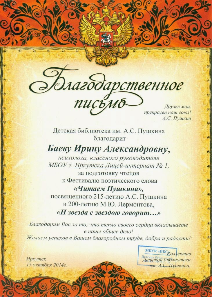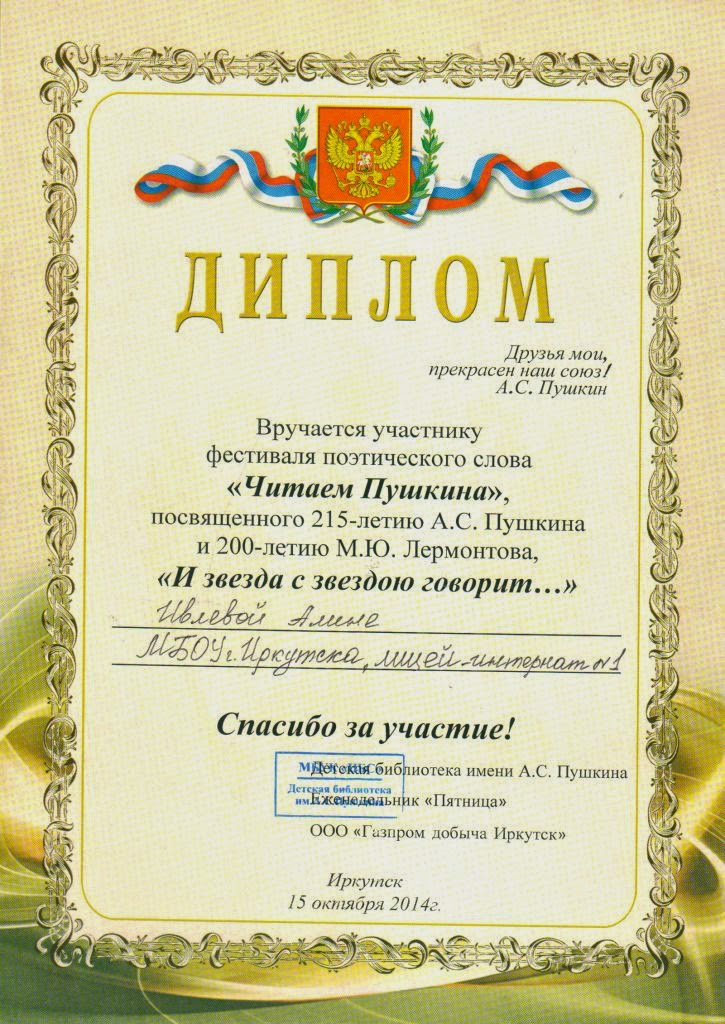 Ежегодно, на протяжении нескольких лет, на фестиваль приезжают дети из различных городов и поселений Иркутской области. В этом году в мероприятии принимали участие учащиеся из школ п.г.т. Мегет, п. Жигалово, г. Иркутска и др. Благодарим лицеистов, принявших участие в этом фестивале. Поздравляем Колмынина Рустама, учащегося 7а класса, ставшего лауреатом и участников: Ивлеву Алину, учащуюся 1б класса, Полторака Макара, учащегося 5б класса. С лицеистами на фестивале присутствовала библиотекарь Ербанова Екатерина Терентьевна, благодаря которой при подготовке к фестивалю Рустам, Алина и Макар погрузились в поэзию А.С. Пушкина и М.Ю. Лермонтова, узнали много нового и интересного из жизни русских поэтов. "Друзья мои, прекрасен наш союз!", – словами А.С. Пушкина Екатерина Терентьевна напомнила лицеистам о приближающемся "Дне лицеиста". Фотоархив.